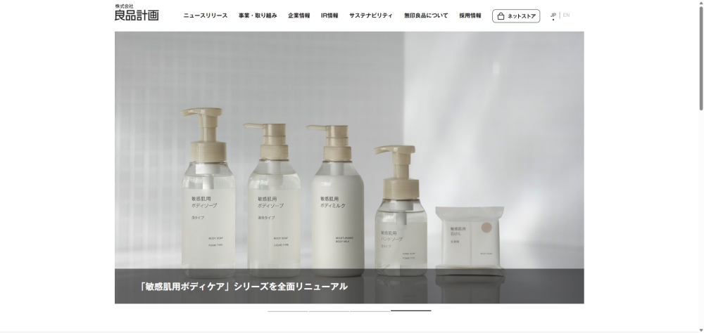 画面全体を広々と使えるため、多くのメニュー項目をカテゴリ分けして分かりやすく配置したり、画像や動画を背景に使ってブランドイメージを表現したりと、デザインの自由度が高いのが特徴です。これもヘッダーのアイコンが全ページに共通で設置されており、サイト全体の主要なページへ案内するため、グローバルナビゲーションの一種です。